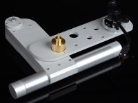 Highly rigid main plinth is constructed of two massive blocks machined from solid aluminum, bolted together and damped accordingly, and a 50/10mm diameter aluminum pipe, forming together a T-shaped structure. Employing this kind of design provides perfect balance for the plinth itself, by reducing the Moment of inertia in all three planes (along all three axes) to the Center of mass, thus gaining uniform vibration damping.