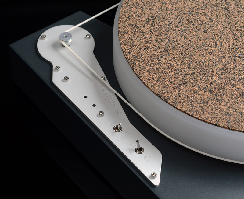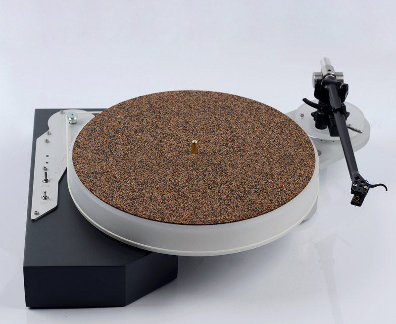 The massive third leg, a big adjustable cone machined from solid aluminum provide leveling and support the sub-plinth, yet it is 3-point coupled to the sub-plinth by means of rubber-cork washers of different dimensions and diameters, stopping any adverse outer vibrations to reach the sub-plinth and to disturb the delicate system of bearing/platter/record - cartridge - tone-arm.