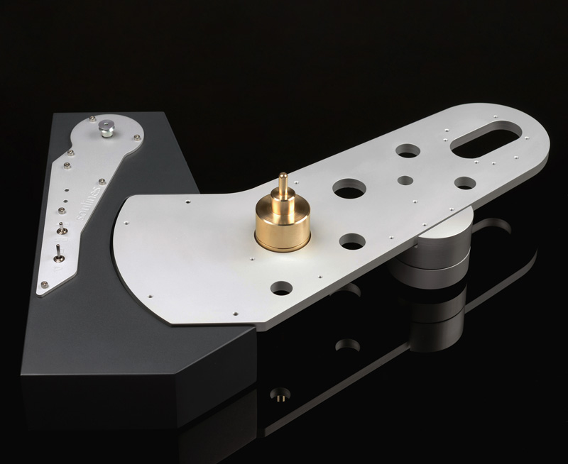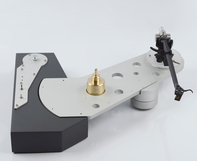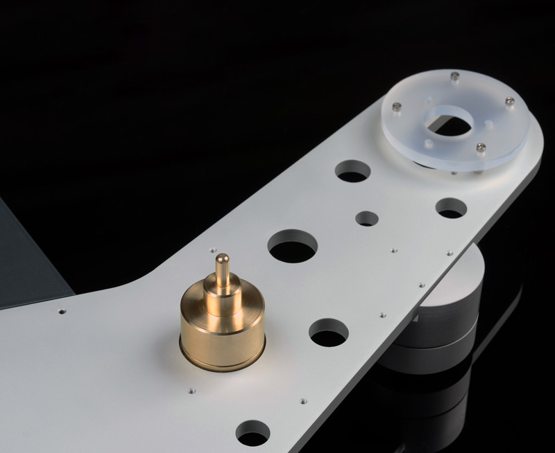 Mass distribution is carefully calculated, placing the Center of mass on the central vertical axe of the main bearing, in the sub-plinth horizontal plane.