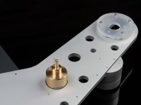 The platter, 30mm thick and weighing 2.6kg is machined from Acrylic to very high accuracy and together with the massive inverted main bearing employing Derlin trust plate (same like in our more advanced models) ensures good speed stability. The use of mat is completely up to the user preferences, thankfully to the 1.0mm deep recess carved into the top plane of the platter in the middle (for the record paper label) and to the fact that Acrylic proved itself as a great turntable mat "material".