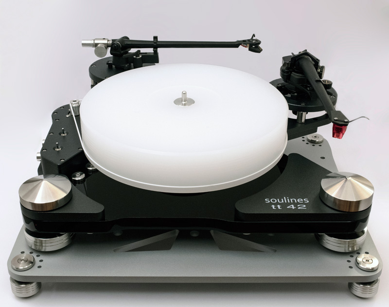 Design of the tt42 was done using 3D-modeling software and employing Golden Ratio and Fibonacci sequence, in order to attain a fully mechanically balanced system. Thus, the center of mass of the turntable is placed onto the vertical axis of rotation of the main bearing shaft/platter, reducing Moment of inertia to the very center of the mass. To gain uniform vibration damping across the whole frequency spectrum, different materials like acrylic, aluminum and stainless steel, had been chosen for the plinth and sub-plinth components according to their specific mechanical characteristics. All the components are precisely CNC machined and hand finished to the highest standards.